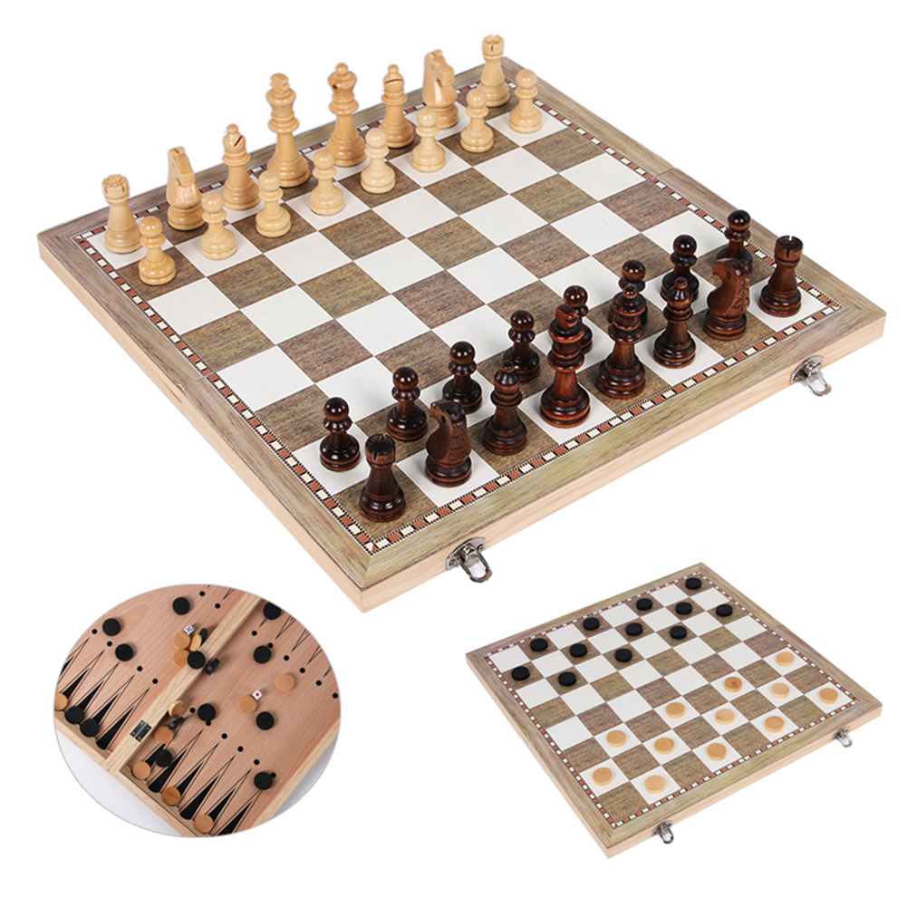 Wood Chess Set Portable Game Of Checkers Backgammon Folding 24CM