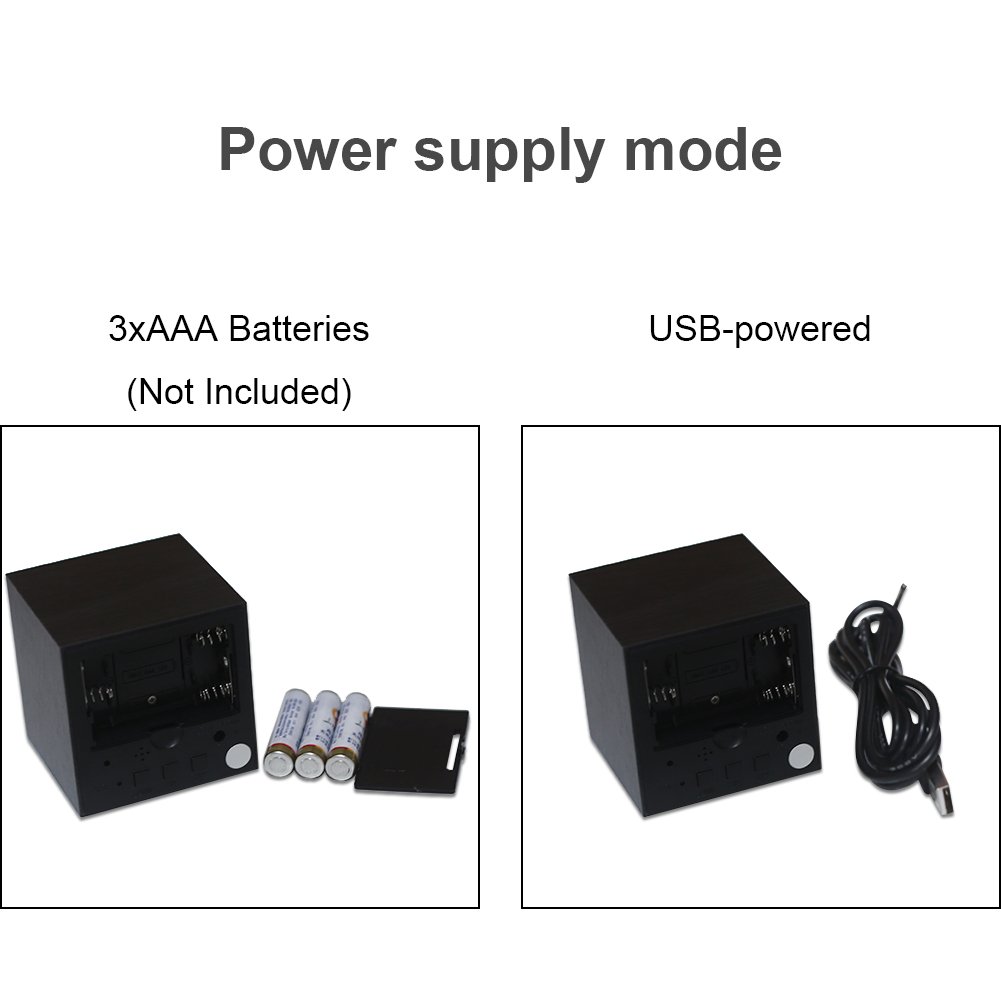 Wooden Digital Alarm Clock LED Light Multifunctional Modern Cube Displays Date Temperature for Home Office Black wood white word