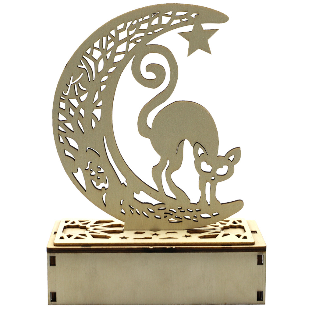 Wooden Halloween Ornament Carving Hollowed Moon Witch Decor with LED Light JM01993