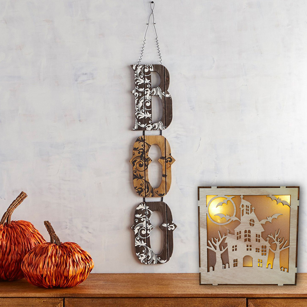 Wooden Hollow Hanging Pendant Pumpkin Haunted House LED Lights 3D Halloween Party Decoration Crafts JM01498