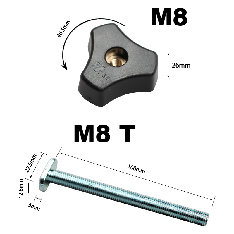 Both T-Screw and Screw are of 8mm threaded. Also ideal for clamping jigs and fixtures. Puts clamping pressure anywhere along the flush-mounted T-Slot T-Track. Slides into T-Track & quickly secures with the turn of the hand knob. This is for a set of new Hold Down Clamps for use with T-Slot track. These clamps are useful in many woodworking & metalworking applications for work holding, positioning, and fixturing.
