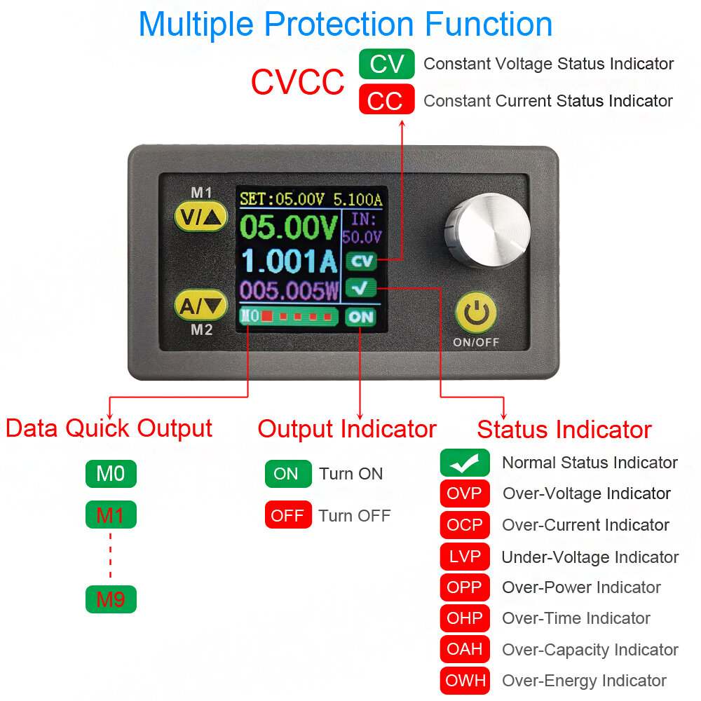 2> .M1 bouton: Appuyez brievement pour regler la valeur de tension de sortie ou utilise comme bouton d'augmentation. Un appui long est utilise pour lire le groupe de donnees M1 ou quitter.